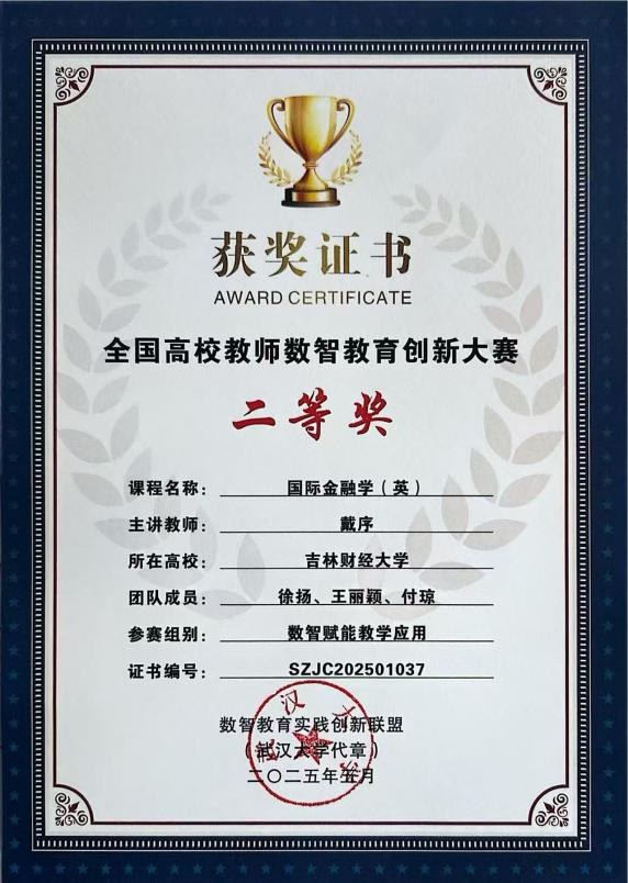 近日,高校教学创新赛事传来捷报,酷爱成人网 酷爱成人网 戴序老师凭借双语课程《国际金融学》的突出创新实践,先后荣获首届全国高校教师数智教育创新大赛(数智赋能教学应用赛道)二等奖、第十届西浦全国大学教学创新大赛年度教学创新三等奖。