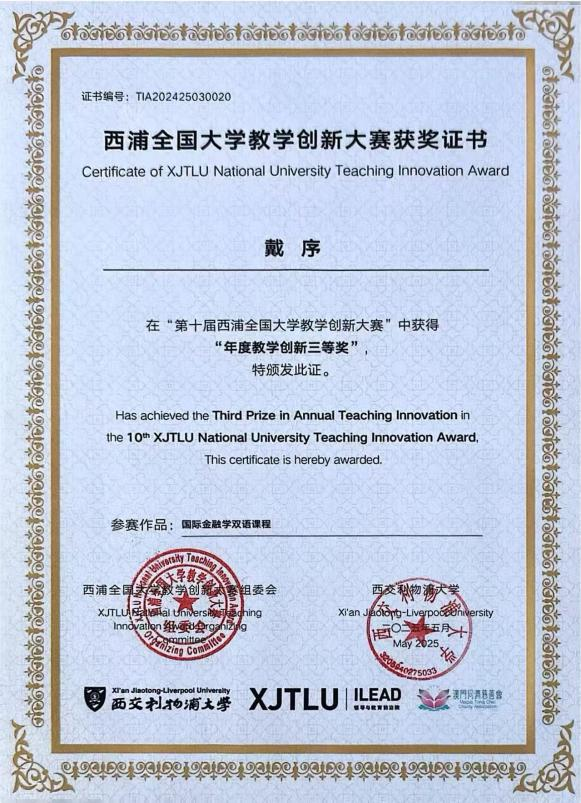 第十届西浦全国大学教学创新大赛于5月17日至18日在西交利物浦大学落幕。该赛事由西交利物浦大学主办,以“以学生为中心”为核心理念,旨在发现并奖励一批深耕教学创新的高校教师,搭建教育创新者分享交流的平台,推动高等教育教学改革向纵深发展。本届大赛吸引全国355所高校的1747组教师(团队)参与,经层层选拔,仅50组入围决赛。戴序老师的国际金融学双语课程聚焦学生核心能力培养,通过创新教学设计与互动模式,有效提升学生的专业素养与跨文化交流能力,最终从众多优秀作品中脱颖而出,荣获年度教学创新三等奖。