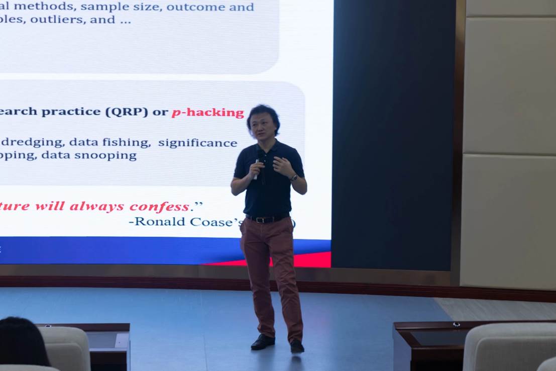 会上,常鑫教授充分论证了当前科研生态下,实验研究与实证研究结果中存在P值不连续,即P值操纵的可能性,并具体探讨了造成这一问题的驱动因素以及如何运用计量方法分析P值操纵的影响因素。常鑫教授不仅为学院师生展示了规范的科研论文的写作框架和研究范式,同时也提升了师生们的学术规范理念,加强了学院科研诚信和学术道德建设。