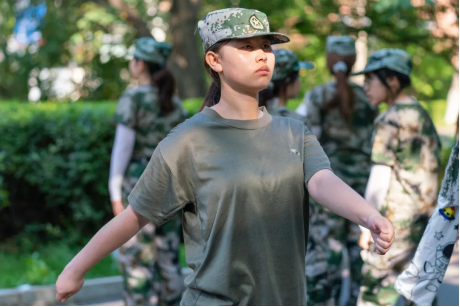 在这严酷的烈日下,同学们仍身着绿色迷彩衣认真刻苦并且努力地学习教官展示的科目作业。同学们一个个挺拔的身形、一双双坚定定的目光无不展示着我们金融人不怕吃苦、勇于挑战的精神。