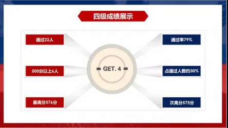 2019年12月场次四级考试中,金工1920班报名四级28人,通过22人,通过率近79%。其中,500分以上6人,占报名人数30%,班级四级最高分陈宇同学576分,次高分吴俊瑶同学575分。截止目前全班四级通过率已达到84%,六级通过率达到56%。